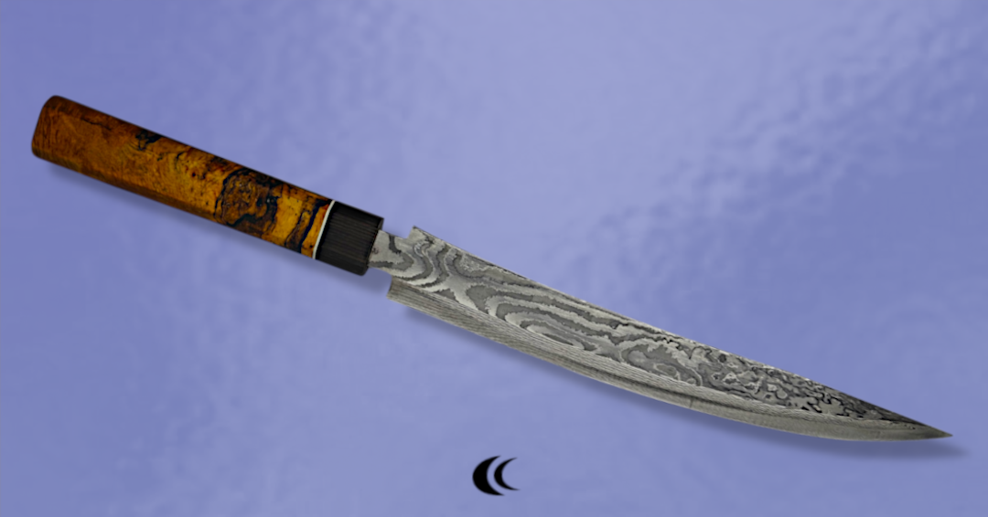 Couteau japonais avec une lame asymétrique réalisé par Jean dans l’atelier de Couteaux Caprice en 2 jours. La lame est en acier de damas inoxydable motif « Nuage » C’est une émouture asymétrique pour droitier. Le manche est en Noyer de Turquie avec une garde en Ebène et un intercalaire en G10 blanc.