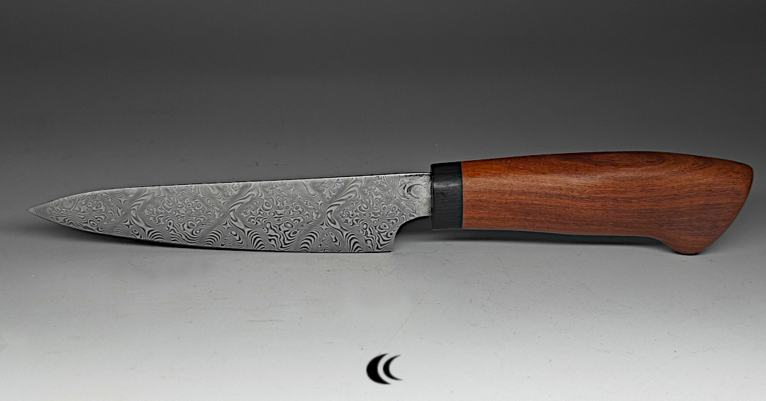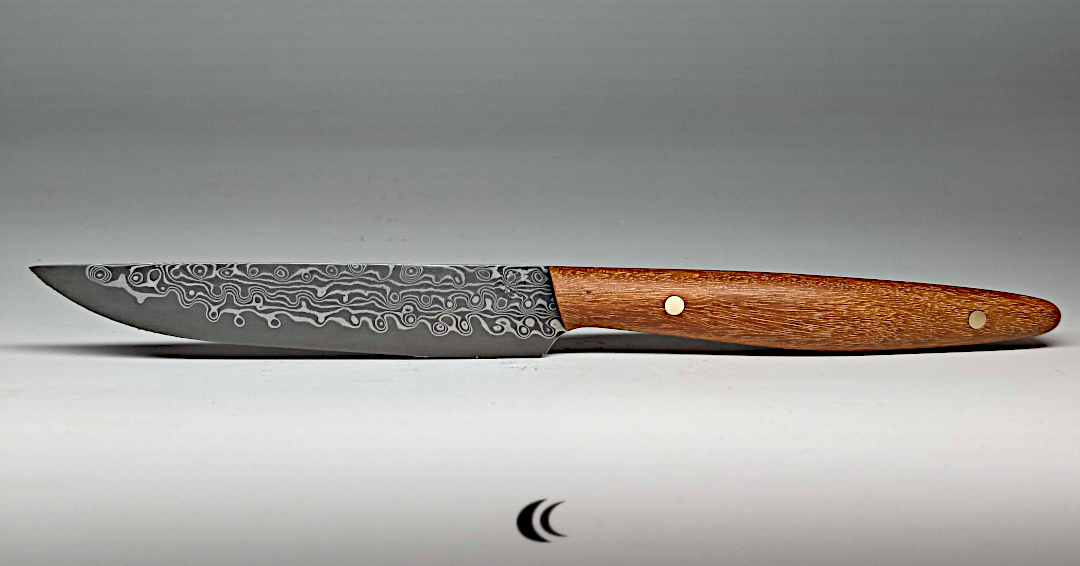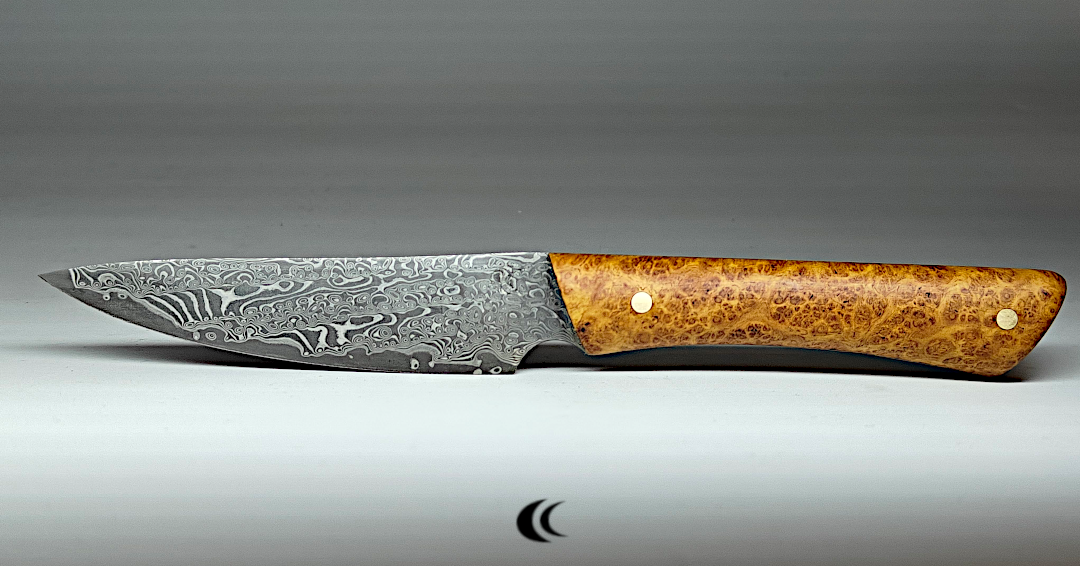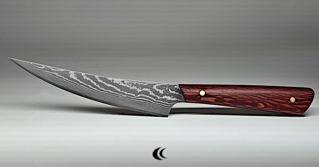 Un demi-couteau de chef ;-). Le couteau est intégralement en acier de damas motif aléatoire. La construction de l’acier est du 1095 et 15N20. C’est la déclinaison d’un couteau de chef avec un design minimaliste qui permet de garder un poids raisonnable malgré sa construction plein acier.