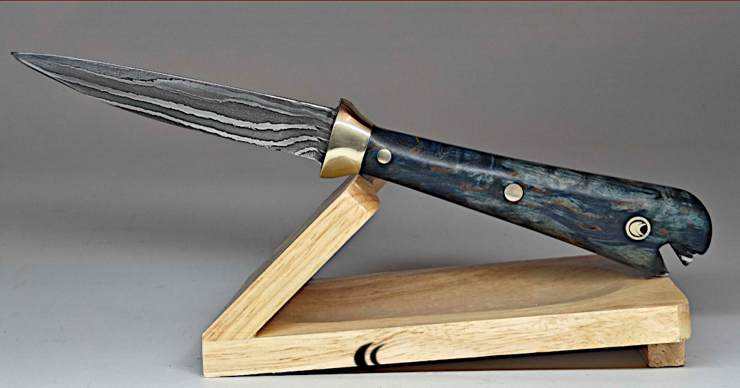 Couteau à ouvrir les huitres. La lame est en acier de damas (1095/15N20) motif « Linear » avec des mitres en laiton. Le manche est en « Bouleau Madré » stabilisé tinté bleu pour rappeler la mer. Il est fixé à l’aide de rivets en laiton. A l’arrière du manche, l’encoche serre à casser le bord de la coquille d’huitre si la lame n’arrive pas à la pénétrer.