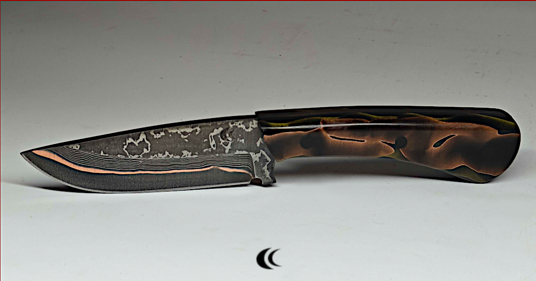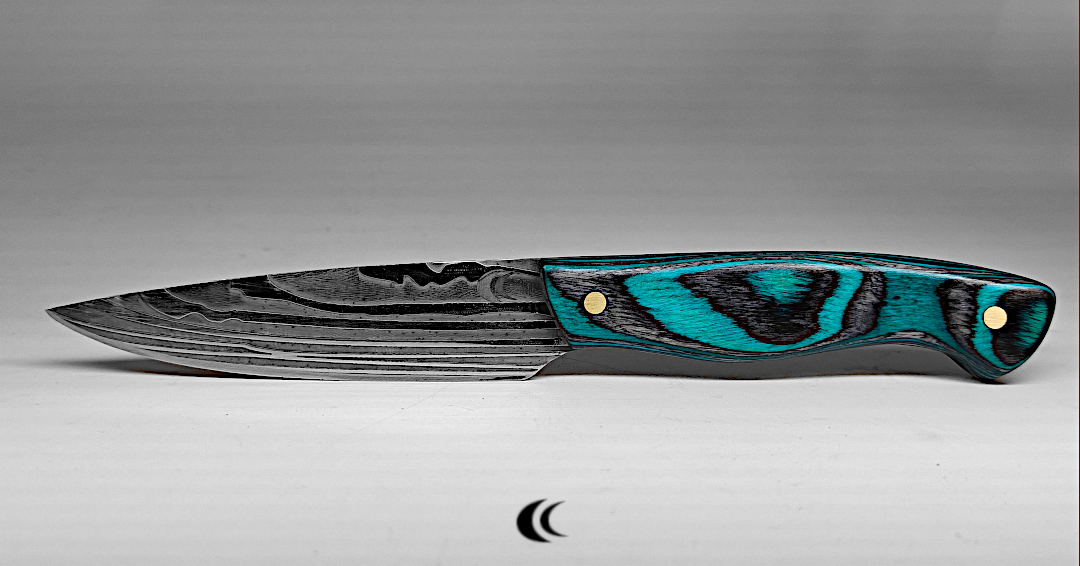 Petit couteau à tout faire. La lame est en acier de damas avec une couche de cuivre au centre qui donne cette belle ligne sur la lame. Le manche est en résine époxy avec des incrustations en cuivre qui rappelle le cuivre de la lame. Il est fixé à l’aide de rivets en fibre de carbone qu’il les rends très discret.