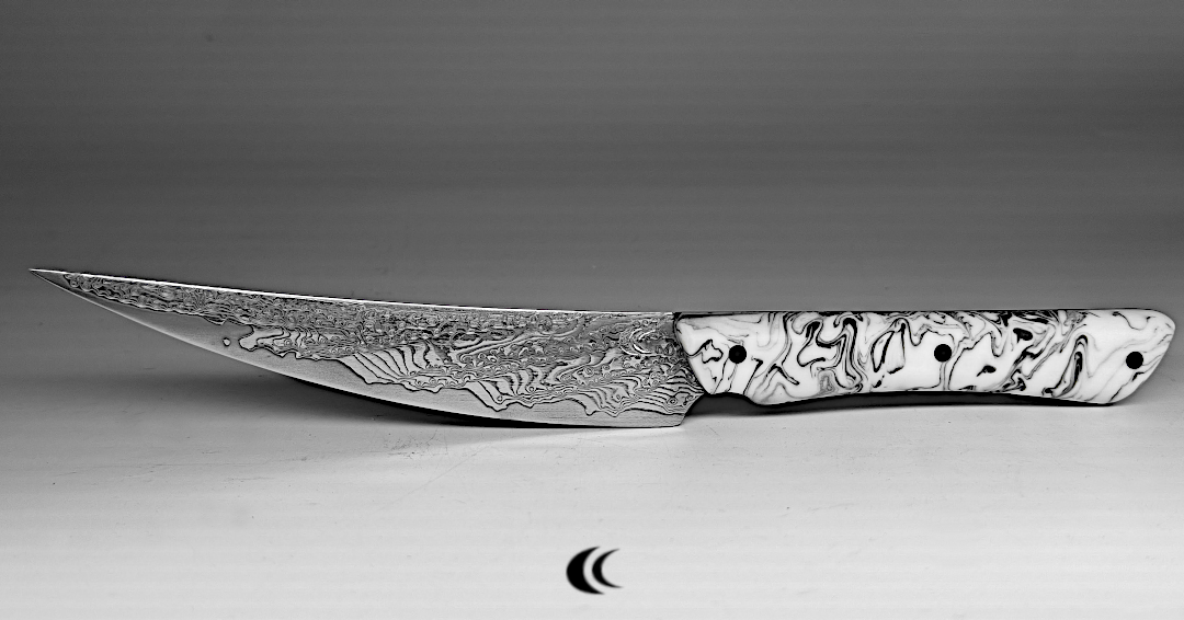 La lame est en acier de damas VG10 motif « Aléatoire ». Le motif est fortement révélé pour donner ce résultat très marqué et creusé en 3 dimensions. Le manche est en résine époxy blanc avec des motifs noirs qui prolongent les motifs de la lame. Les rivets qui tiennent le manche sont en fibre de carbone noir.